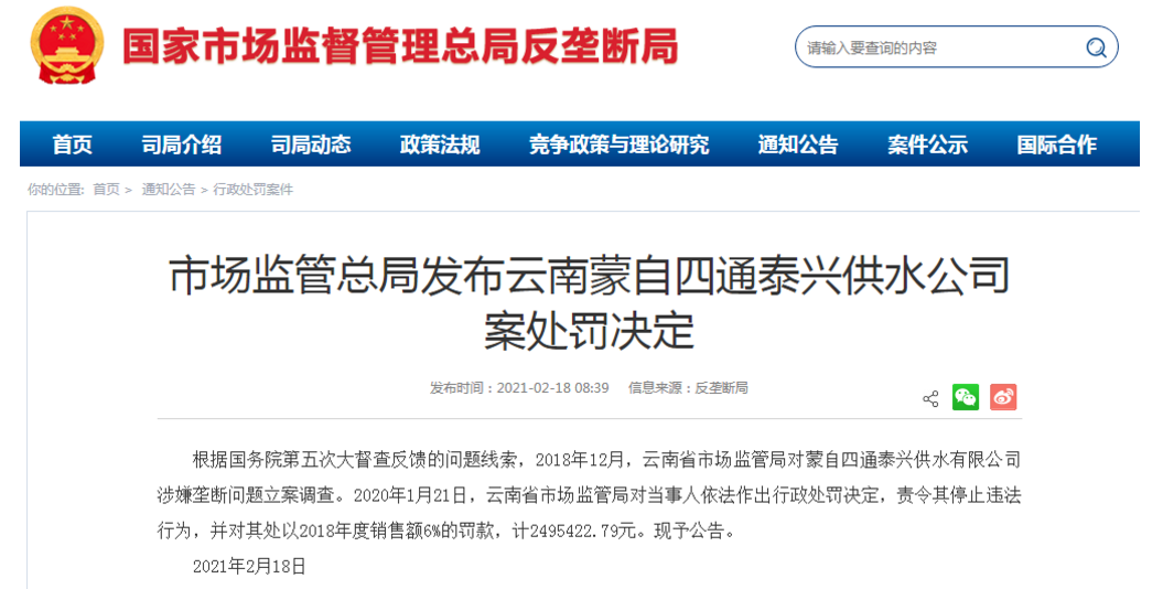 根據(jù)國務院第五次大督查反饋的問題線索,2018年12月,云南省市場監(jiān)管局對蒙自四通泰興供水有限公司涉嫌壟斷問題立案調查。2020年1月21日,云南省市場監(jiān)管局對當事人依法作出行政處罰決定,責令其停止違法行為,并對其處以2018年度銷售額6%的罰款,計2495422.79元。