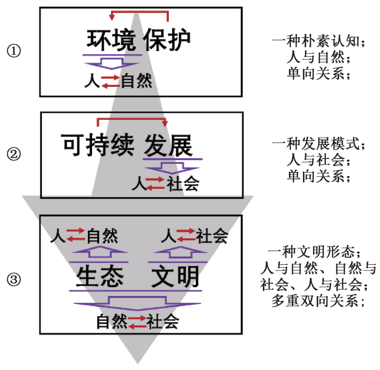 “生態(tài)文明”的概念,描述的則是一種歷史上未曾出現(xiàn)過的文明形態(tài)。它提出以“人與自然、自然與社會、人與社會和諧共生、良性循環(huán)、全面發(fā)展、持續(xù)繁榮”為基本宗旨的社會形態(tài)。它的內(nèi)涵包括而又超越之前的認(rèn)識,“生態(tài)”兩字反映著人與自然的關(guān)系,保護(hù)自然同時享用自然;“文明”兩字反映著人與自然、社會之間的關(guān)系,人類要敬畏自然,個人服從社會,同時社會支撐個人的發(fā)展;“生態(tài)”與“文明”銜接,反映著自然與社會之間的關(guān)系,自然以資源的方式為社會提供物質(zhì)基礎(chǔ),社會以科技的方式尊重自然。“生態(tài)文明”概念,蘊(yùn)含多重雙向關(guān)系,超越了狹義的“環(huán)境保護(hù)”以及“可持續(xù)發(fā)展”,在關(guān)注“人與自然”關(guān)系的傳統(tǒng)觀念基礎(chǔ)上,增加了對“自然與社會”和“人與社會”之間和諧關(guān)系的強(qiáng)調(diào),是對環(huán)境保護(hù)概念的一次創(chuàng)造性升級深化,為人類文明的走向提供了一種超越“工業(yè)文明”的新形態(tài),即,這是一種“生態(tài)”的“文明”,這種“文明”以文明的方式對待“生態(tài)”。