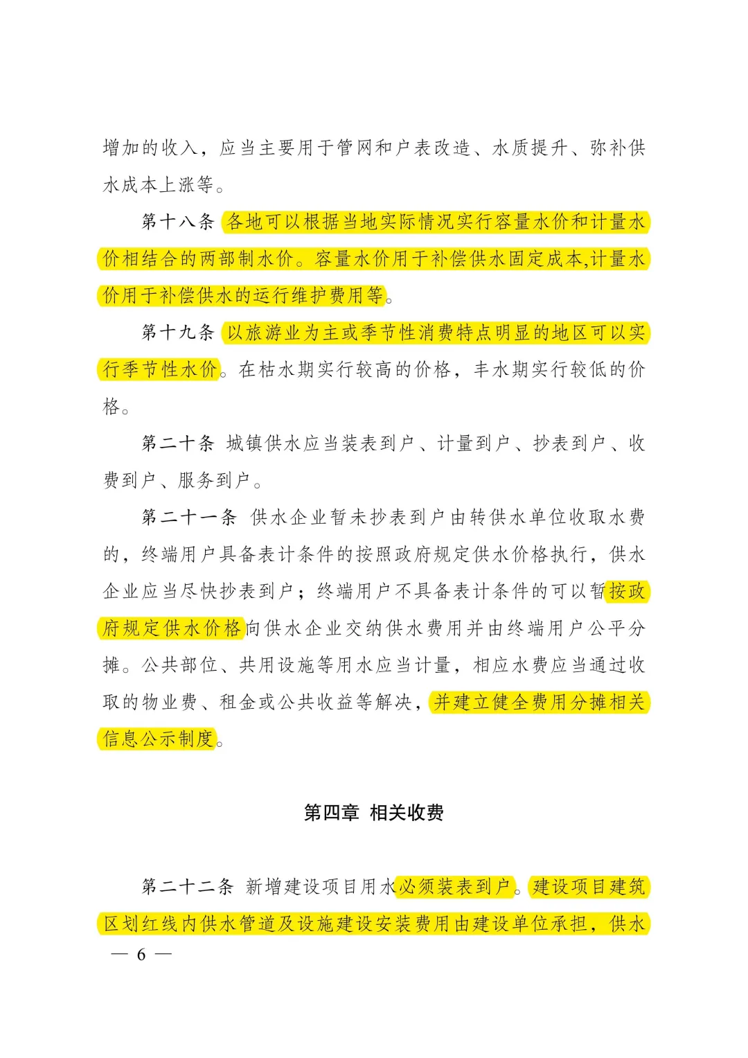 答:《城鎮(zhèn)供水價(jià)格管理辦法》明確了城鎮(zhèn)供水價(jià)格的定價(jià)原則、定價(jià)方法、定調(diào)價(jià)程序,以及水價(jià)分類(lèi)、計(jì)價(jià)方式、規(guī)范供水企業(yè)服務(wù)收費(fèi)行為等。主要內(nèi)容:一是按照“準(zhǔn)許成本加合理收益”的方法核定城鎮(zhèn)供水價(jià)格。制定城鎮(zhèn)供水價(jià)格,以成本監(jiān)審為基礎(chǔ),通過(guò)核定準(zhǔn)許成本、監(jiān)管準(zhǔn)許收益確定準(zhǔn)許收入,根據(jù)核定供水量確定供水價(jià)格,并統(tǒng)籌考慮當(dāng)?shù)毓┧聵I(yè)發(fā)展需要、促進(jìn)節(jié)約用水、社會(huì)承受能力、服務(wù)質(zhì)量等因素。二是簡(jiǎn)化水價(jià)分類(lèi)、明確計(jì)價(jià)方式。城鎮(zhèn)供水根據(jù)使用性質(zhì)分為居民生活用水、非居民用水、特種用水三類(lèi),居民生活用水實(shí)行階梯水價(jià)制度、非居民用水實(shí)行超定額累進(jìn)加價(jià)制度。三是規(guī)范定調(diào)價(jià)程序、強(qiáng)化信息公開(kāi)。要求制定居民生活用水價(jià)格水平或定價(jià)機(jī)制應(yīng)當(dāng)按照價(jià)格聽(tīng)證的有關(guān)規(guī)定開(kāi)展聽(tīng)證,并進(jìn)行信息公開(kāi)。四是規(guī)范服務(wù)收費(fèi)行為、提升服務(wù)質(zhì)量。明確供水水質(zhì)、水壓應(yīng)當(dāng)符合國(guó)家規(guī)定標(biāo)準(zhǔn)。除受用戶(hù)委托開(kāi)展的建設(shè)安裝工程費(fèi)用外,供水企業(yè)不得濫用壟斷地位收取供水開(kāi)戶(hù)費(fèi)、接入費(fèi)、增容費(fèi)等費(fèi)用。