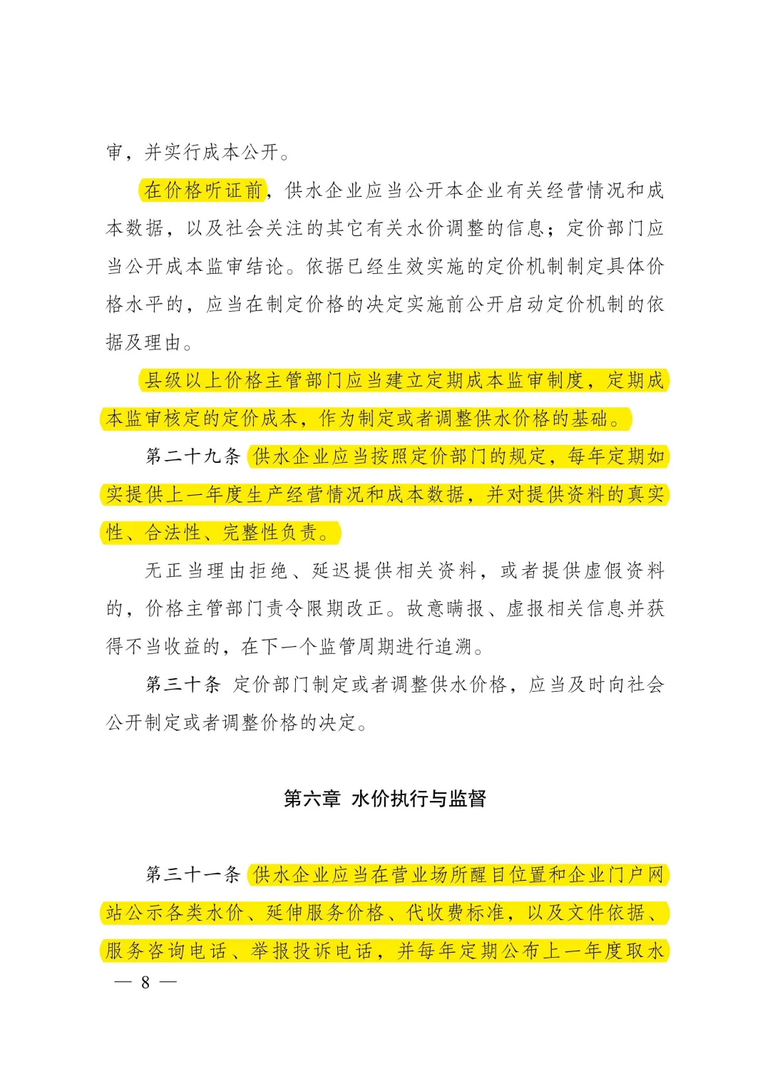 《城鎮(zhèn)供水定價(jià)成本監(jiān)審辦法》明確了定價(jià)成本構(gòu)成和核定方法。主要內(nèi)容:一是明確城鎮(zhèn)供水定價(jià)成本構(gòu)成范圍。按照合法性、相關(guān)性、合理性原則,規(guī)定城鎮(zhèn)供水定價(jià)成本包括固定資產(chǎn)折舊費(fèi)、無(wú)形資產(chǎn)攤銷(xiāo)和運(yùn)行維護(hù)費(fèi),并對(duì)計(jì)入定價(jià)成本的項(xiàng)目作了具體規(guī)定。二是明確定價(jià)成本和有效資產(chǎn)核定方法。細(xì)化明確固定資產(chǎn)折舊、原水費(fèi)、材料費(fèi)、動(dòng)力費(fèi)、人工費(fèi)等成本費(fèi)用的審核標(biāo)準(zhǔn),對(duì)可計(jì)提收益的有效資產(chǎn)范圍及其核定方法做出明確規(guī)定,對(duì)供水企業(yè)職工人數(shù)定員、管網(wǎng)漏損率控制等建立激勵(lì)約束機(jī)制。