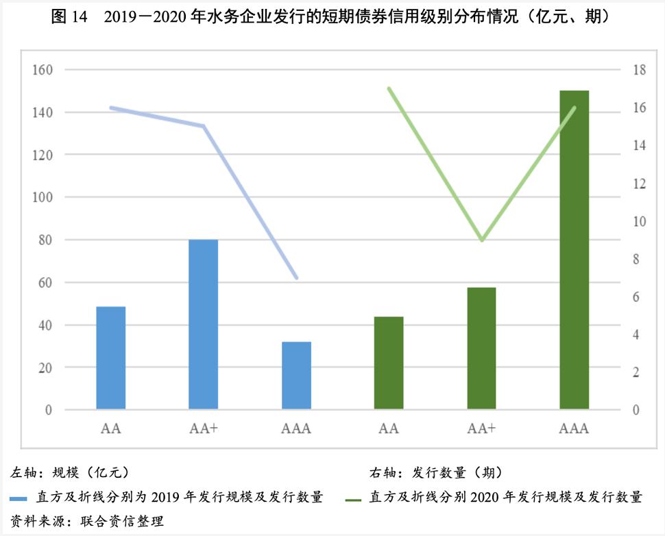 整體來(lái)看,水務(wù)企業(yè)選用短期債券進(jìn)行融資的頻率及規(guī)模有所增加,發(fā)行規(guī)模的增長(zhǎng)主要來(lái)自aaa主體所發(fā)的短期融資券及短期公司債。2020年全年累計(jì)使用短期債券融資較大的企業(yè)為水發(fā)集團(tuán)有限公司(65億元)和廣東粵海控股集團(tuán)有限公司(50億元)。
