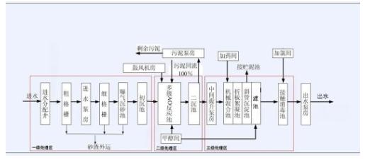 典型的污水廠處理工藝流程是上述方法的組合。以某一級a標準污水處理廠為例,從進水到出水主要分三級處理區(qū),一級處理區(qū)主要應用物理法(包括攔截、沉淀、除砂等)及一定的化學法(初沉池前絮凝);二級處理區(qū)是污水處理工藝核心,主要是以活性污泥為主的生化反應(酶促反應);三級處理區(qū)主要應用物理化學法,通過混凝、過濾、消毒等工藝手段對污水進行深度處理。落實到具體處理工程中,各級各類技術(shù)需針對不同污染物和污染情況進行應用和改進。