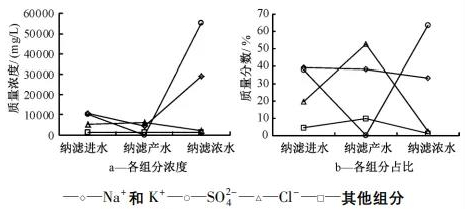 納濾系統(tǒng)進(jìn)水、產(chǎn)水和濃水中各組分平均濃度如圖4所示。