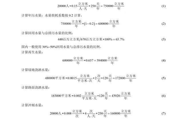3)西安思源學(xué)院不斷踐行低碳節(jié)能環(huán)保,堅(jiān)持創(chuàng)新,并且在污水處理再生水回用取得很好的成效[13][14][15]。西安思源學(xué)院董事會(huì)在2000年學(xué)校從市區(qū)遷往白鹿塬時(shí)就站在保護(hù)環(huán)境、走可持續(xù)發(fā)展道路的高度,利用有限的自有資金,建設(shè)生活污水處理站。鋪設(shè)專(zhuān)用2m2范圍內(nèi)的雨水,以及一座1800立方米的游泳池、3座600立方米的景觀噴水池定期換掉的剩水收集管網(wǎng)300多米,大小再生水水庫(kù)(包括3座景觀噴水池)5座,擁有各種型號(hào)水泵12臺(tái),再生水專(zhuān)用管線25千米。投資一千三百萬(wàn)完成日處理量為(2000+2000)立方米的mbr膜生物反應(yīng)器的土建基礎(chǔ)設(shè)施,安裝了2000立方米/天的處理設(shè)備并于2011年9月順利投入運(yùn)行。學(xué)校于2019年11月再次投資580萬(wàn)元對(duì)污水處理廠原先預(yù)留的2000立方米膜處理設(shè)施進(jìn)行設(shè)備安裝并投入使用。9年半里mbr膜生物反應(yīng)器已經(jīng)處理670萬(wàn)立方米的污水,產(chǎn)出440萬(wàn)立方米符合國(guó)家標(biāo)準(zhǔn)再生水并全部回用。西安思源學(xué)院現(xiàn)有2萬(wàn)名師生。用再生水沖廁,澆灌48hm2綠化地,和澆酒18.3hm2路面。除了西安思源學(xué)院在污水處理再生水回用取得超出國(guó)內(nèi)外許多專(zhuān)家、學(xué)者、制造商的預(yù)料外,還對(duì)所有資金使用、操作程序、運(yùn)轉(zhuǎn)數(shù)據(jù)都有案可查??梢酝ㄟ^(guò)以下的計(jì)算,對(duì)單位里的污水量、再生水量、再生水回用量做個(gè)概算。