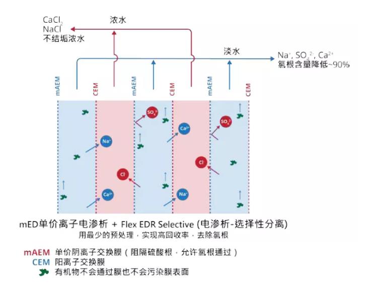 零排放中的預處理配套代價一般比較高,光一個除硬的工藝配套可能都要多級處理,而上述選擇性edr電滲析系統(tǒng)濃縮一價鹽的同時對二價鹽具有截留效率,可以有效避免濃縮過程中部分無機結垢,從而降低系統(tǒng)進水除硬的要求。有時候廢水可以不經過除硬直接進入系統(tǒng),縮短工藝流程,降低系統(tǒng)投資和運行成本等。