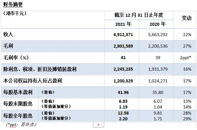 二零二一財(cái)政年度,本集團(tuán)經(jīng)營(yíng)勢(shì)頭穩(wěn)健,錄得收入69.1億港元,較二零二零財(cái)政年度增長(zhǎng)22%;除利息、稅項(xiàng)、折舊及攤銷前盈利22.5億港元,較二零二零財(cái)政年度增長(zhǎng)16%;本公司權(quán)益持有人應(yīng)占盈利12.0億港元,較二零二零財(cái)政年度增長(zhǎng)17%;每股基本盈利41.96港仙,較二零二零財(cái)政年度增加6.16港仙,增幅17%;整體毛利率為41%,較二零二零財(cái)政年度上升2個(gè)百分點(diǎn)。本集團(tuán)融資渠道多元暢通,融資工具長(zhǎng)短期兼?zhèn)?,資產(chǎn)質(zhì)優(yōu),資金充裕,負(fù)債合理,財(cái)務(wù)狀況健康。